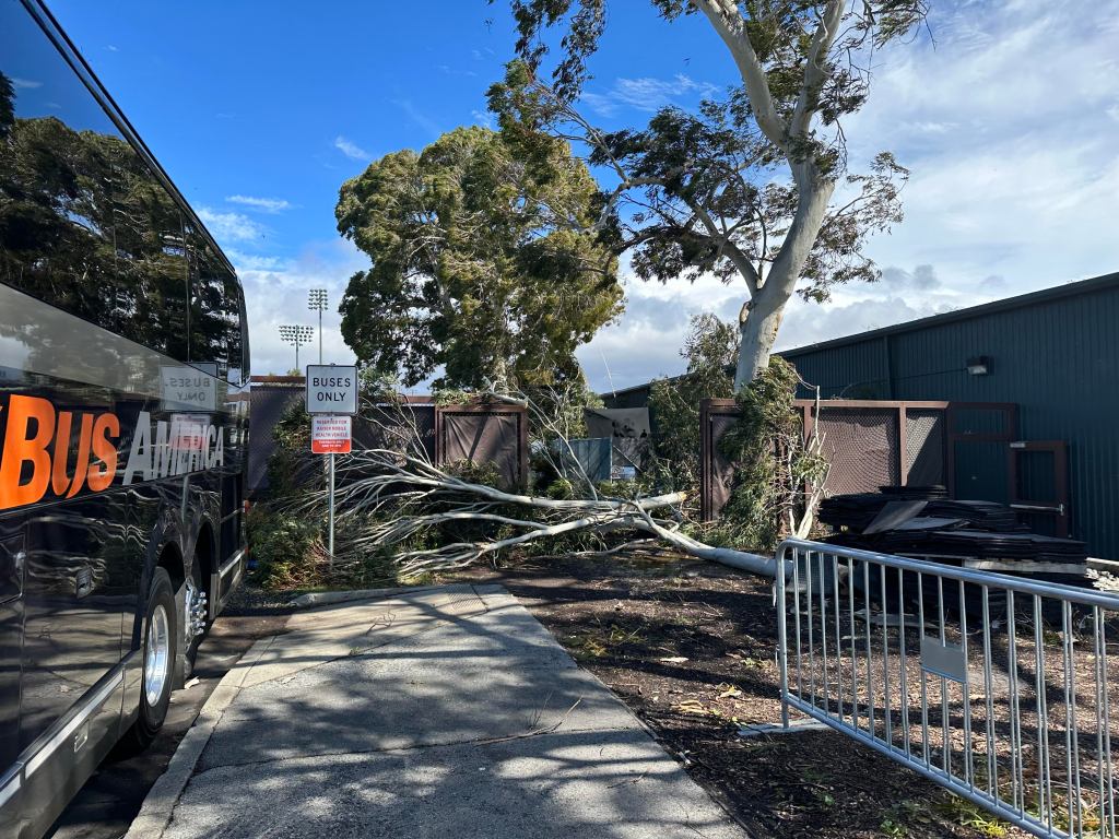 Also making matters a little crazy was a hellacious windstorm that hit the Bay Area, with gusts reaching as high as 97 miles per hour causing trees to fall down all around campus. Southernโs bus nearly had a massive branch of a eucalyptus tree fall onto it while they were in Maples practicing, and Sacred Heartโs bus had to stop twice to avoid falling trees on the way to Stanfordโs campus.