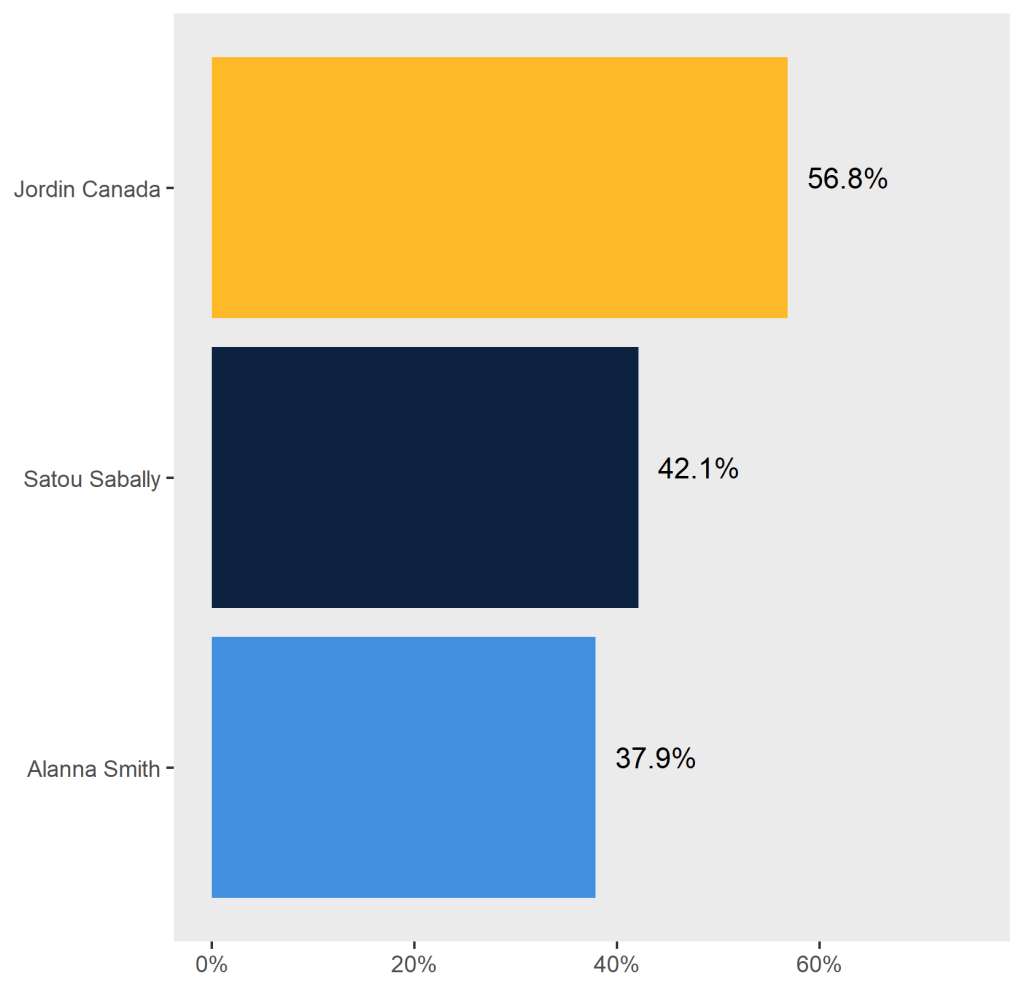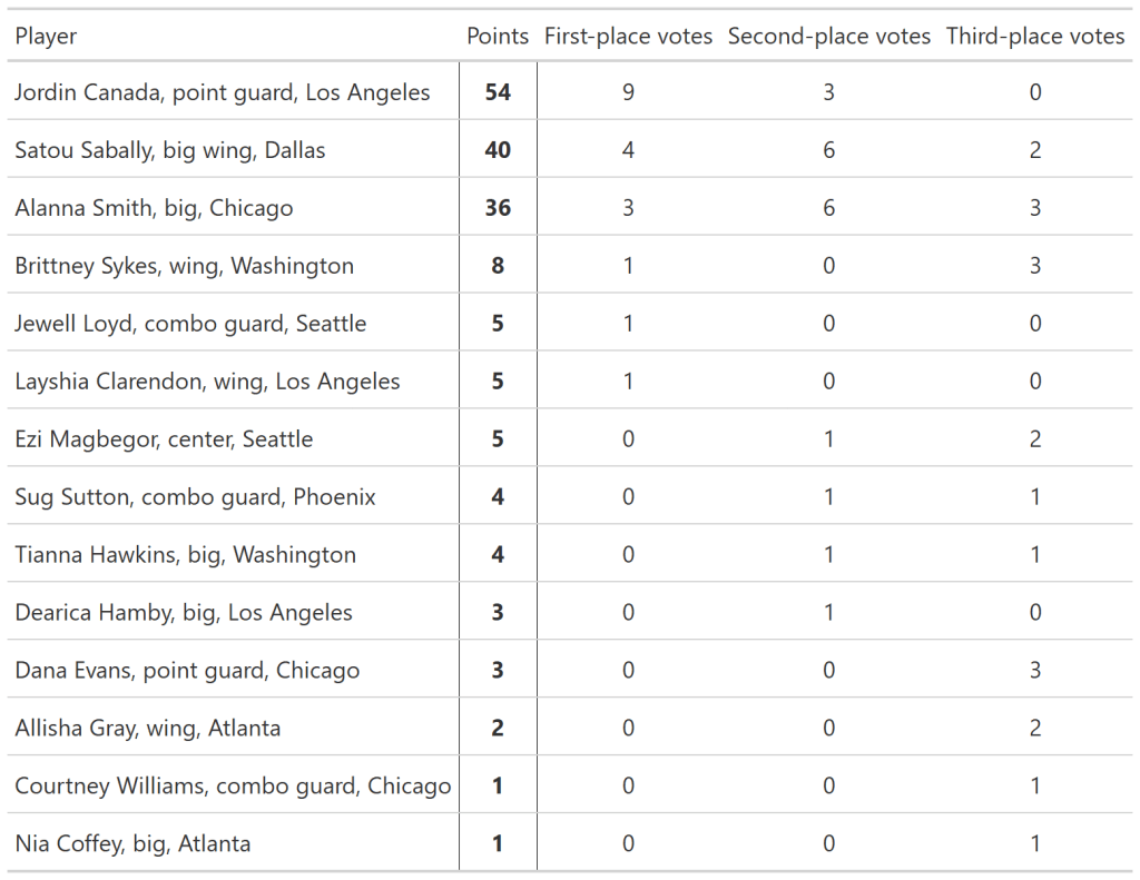 With a relatively tight 56.8% vote share (the percentage of the maximum possible points a player received), The Next’s 2023 WNBA Most Improved Player is Los Angeles’ Jordin Canada. She received a plurality of first-place votes with nine, while Dallas’ Satou Sabally earned three first-place votes and Chicago’s Alanna Smith received two. Washington’s Brittney Sykes, Seattle’s Jewell Loyd, and Los Angeles’ Layshia Clarendon also received a first-place vote each.