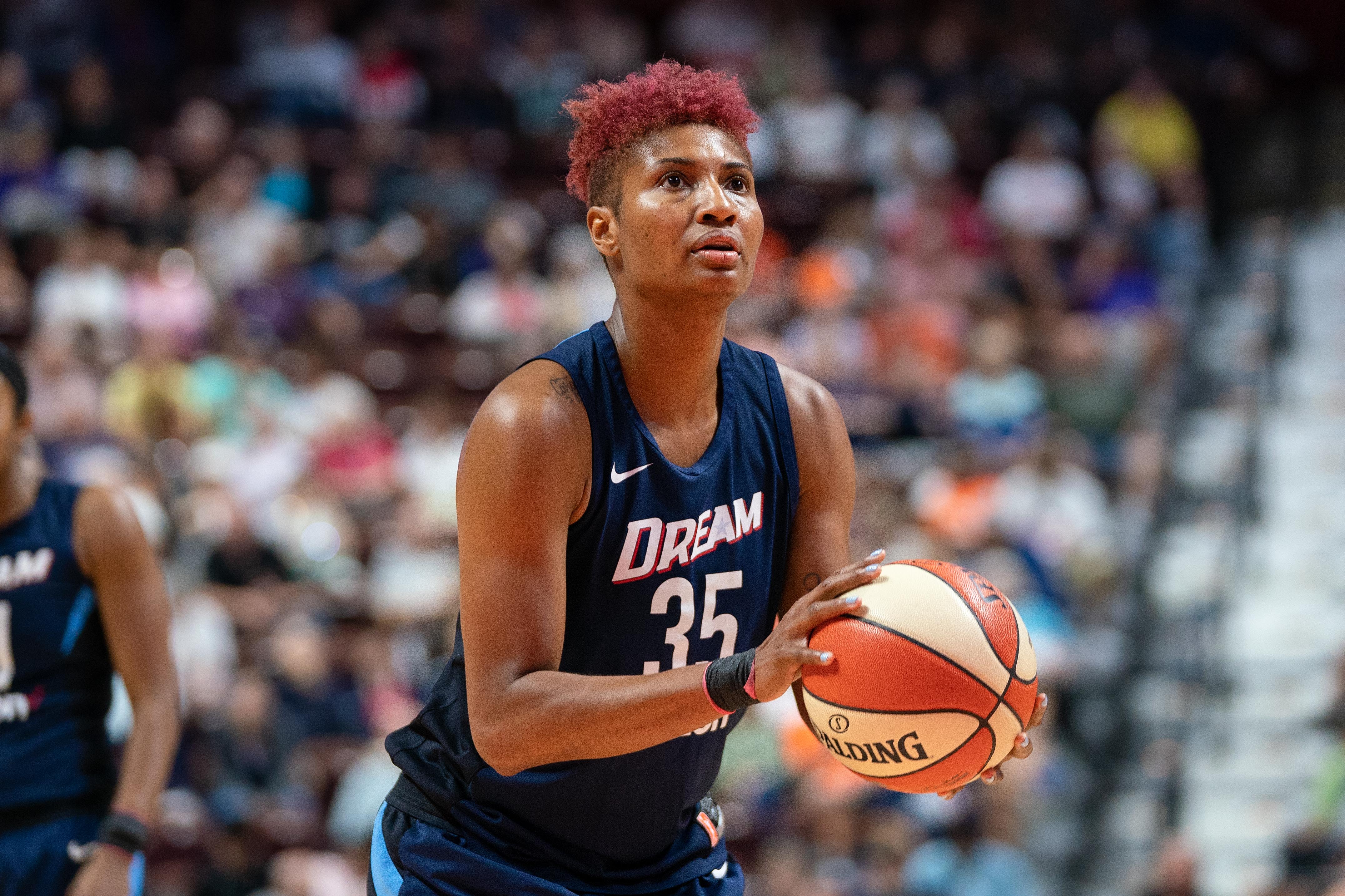 Uncasville, Connecticut/USA – July 17, 2018: Atlanta Dream forward Angel McCoughtry (35) shooting a free throw during a WNBA basketball game between the Atlanta Dream and the Connecticut Sun at Mohegan Sun Arena. The Atlanta Dream defeated the Connecticut Sun 86-83. Photo Credit: Chris Poss