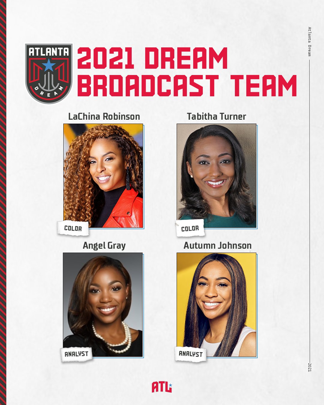 โAs the Atlanta Dream experiences new beginnings we are extremely excited to announce our new broadcast team for the 2021 season,โ said Renee Montgomery, Dream co-owner and vice president. โThis broadcast team of all women is another positive step in our goal of providing empowerment to the diverse Atlanta community. Itโs exciting knowing that moments such as these will create momentum, and we plan to keep that same level of energy moving forward.โ