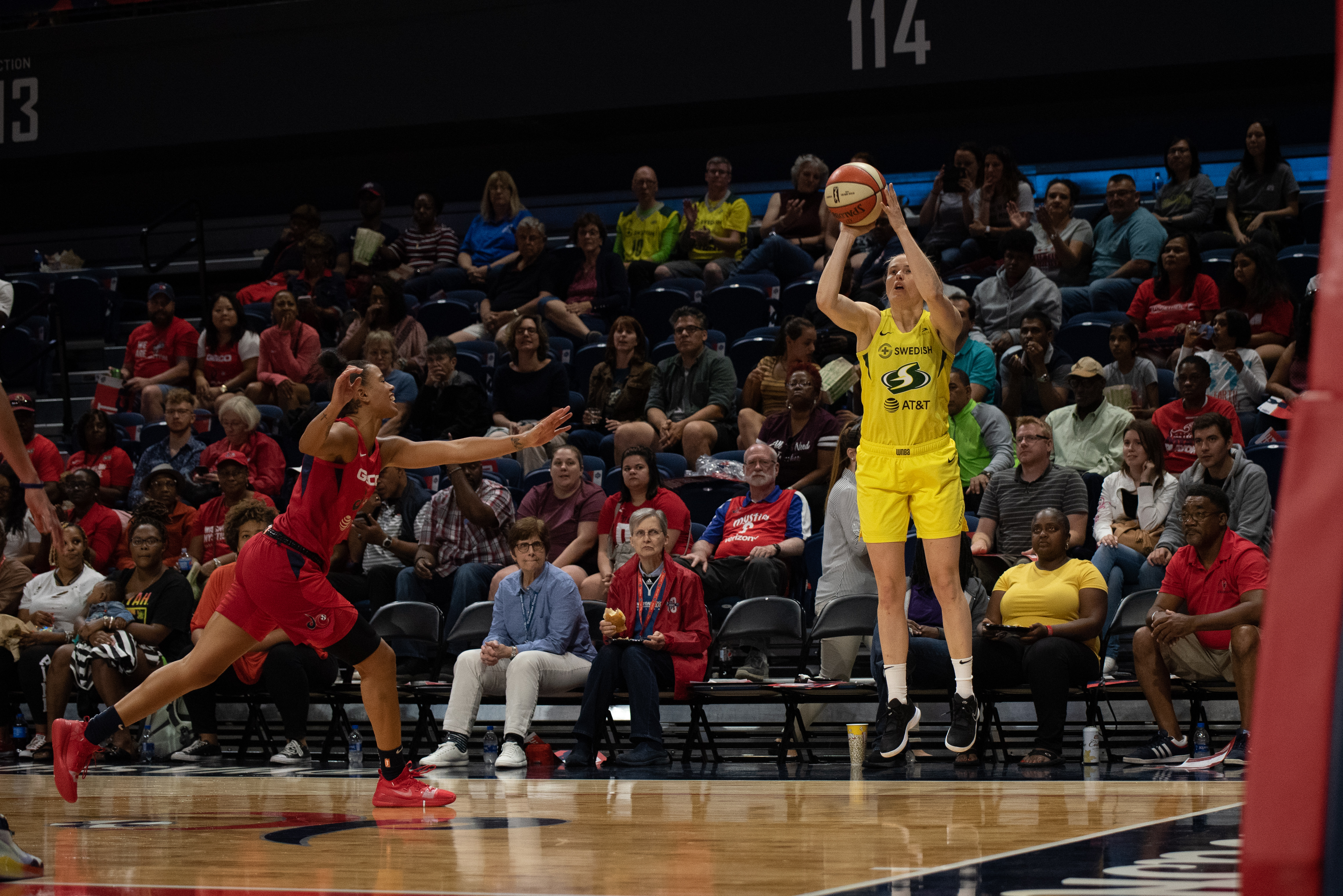 Seattle Storm guard Sami Whitcomb shoots in a game against the Washington Mystics on June 14, 2019. Photo credit: Domenic Allegra