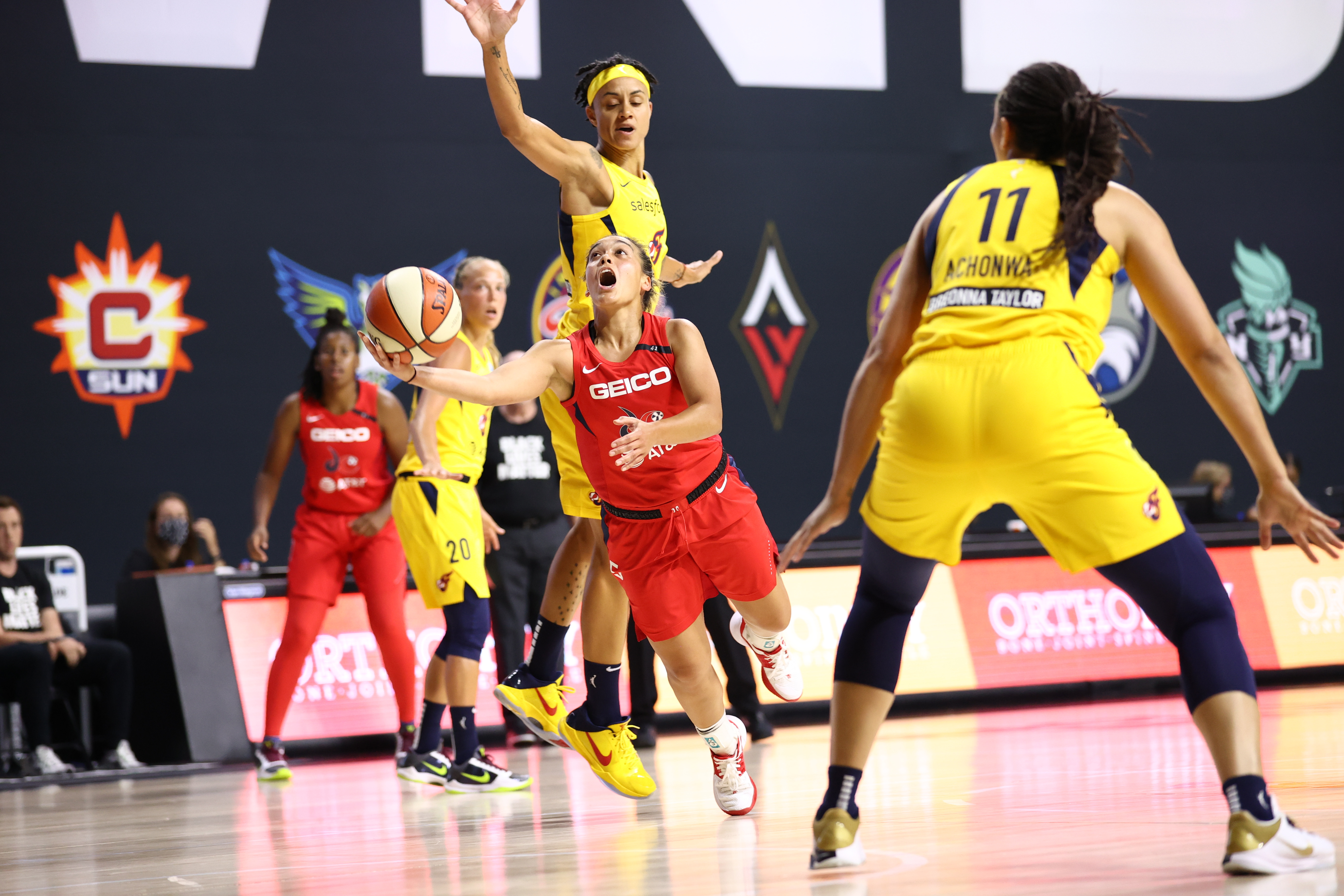 Washington Mystics point guard Leilani Mitchell draws a foul—and makes the scoop shot—in a game against the Indiana Fever on July 25, 2020. Photo credit: NBA Content Network
