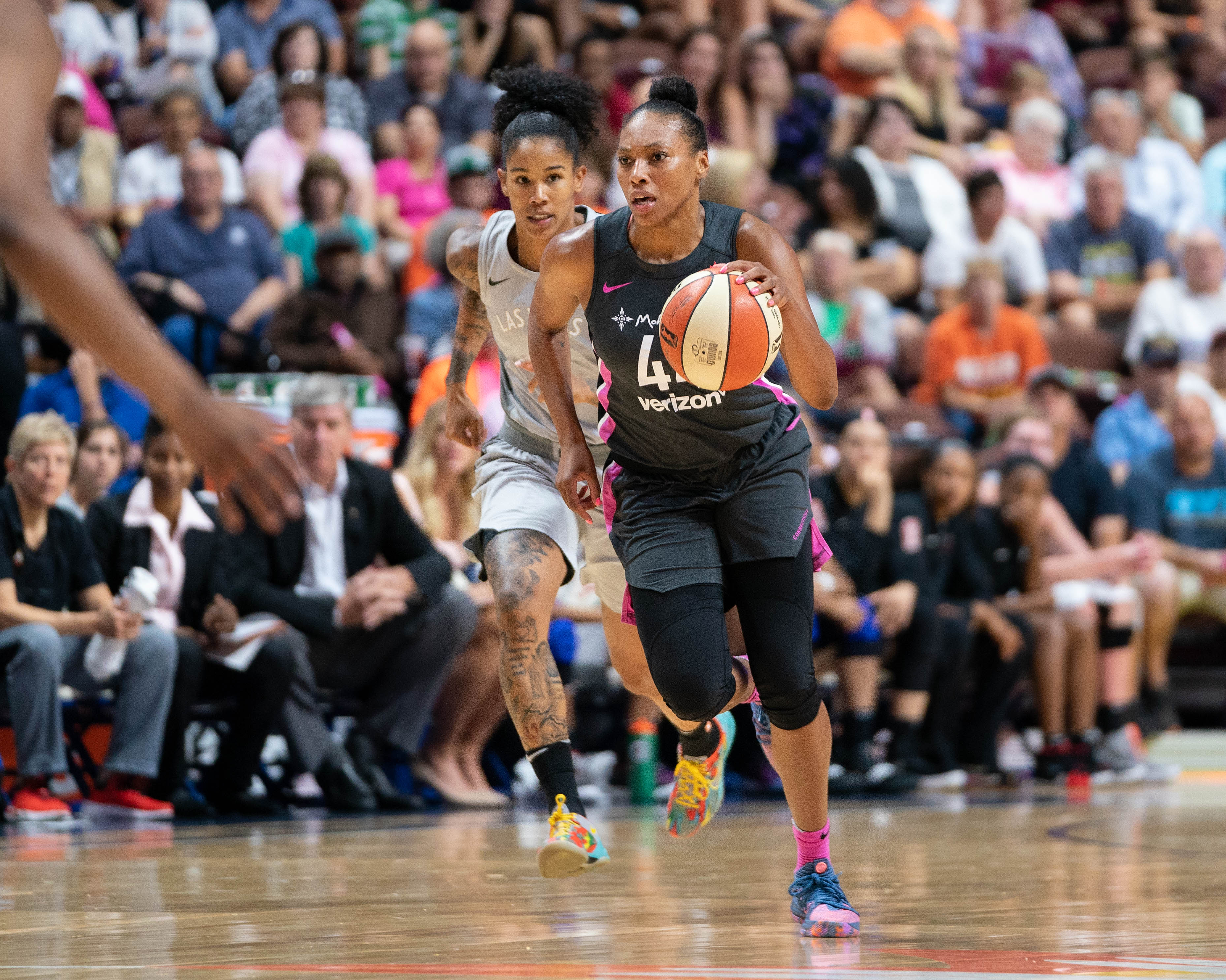 Uncasville, Connecticut/USA – Aug. 05, 2018: Connecticut Sun forward Betnijah Laney (44) during a WNBA basketball game between the Las Vegas Aces and the Connecticut Sun at Mohegan Sun Arena. The Connecticut Sun defeated the Las Vegas Aces 109-88. Photo Credit: Chris Poss