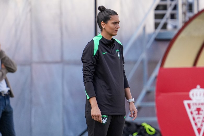 Boston Legacy FC head coach Filipa Patão stands and watches her team from the sideline.