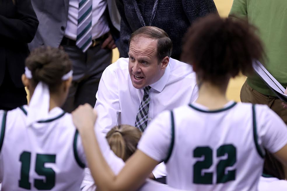 CLEVELAND, OH – JANUARY 14: Cleveland State Vikings head coach Chris Kielsmeier in the huddle during the fourth quarter of the women’s college basketball game between the Green Bay Phoenix and Cleveland State Vikings on January 14, 2023 at the Wolstein Center in Cleveland, OH. (Photo by Frank Jansky)