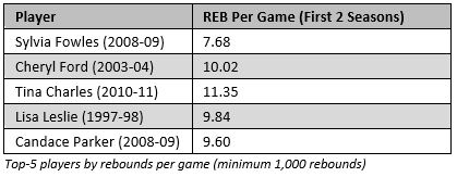 Despite what can look like a slow start, itโs worth keeping in mind that two players who have each been the leagueโs leading rebounders donโt appear in either of these tables. Tamika Catchings (now 3rd all-time in career rebounds) took 125 games to get to 1,000 rebounds, and Rebekkah Brunson (who Fowles just passed) took 164 games and averaged just 4.54 rebounds over her first two seasons playing off the bench and alongside fellow elite rebounder Yolanda Griffith.