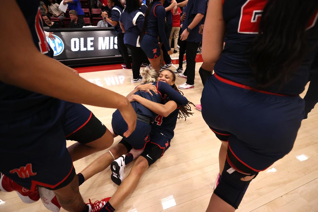 Madison Scott embraces team after win over Stanford in the second round of the NCAA Tournament, March 19th, 2023, in Stanford, CA. (Photo credit: Joshua McCoy/Ole Miss Athletics)
