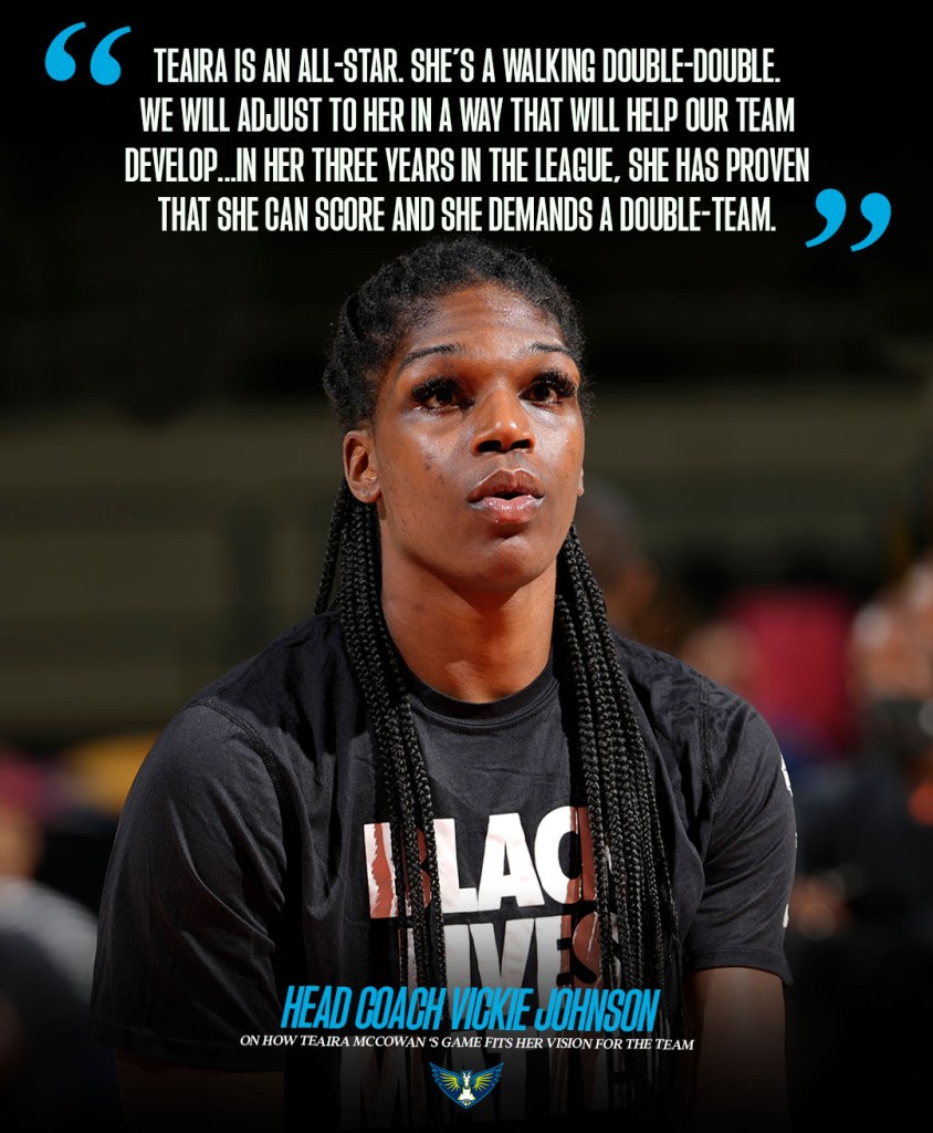 When head coach Vickie Johnson addressed the media during the introductory press conference Wednesday, she called the acquisition of 6’7″ center Teaira McCowan from the Indiana Fever a blessing as they continue to build the foundation the team started last season.