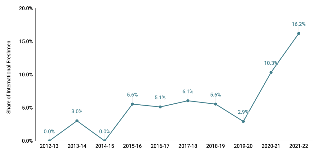 In particular, Ivy League recruiting has become more international with the past two freshman classes: In the eight seasons between 2012-13 and 2019-20, 10 international freshmen dotted the eight Ivy rosters, representing 3.6% of the league’s freshmen women’s basketball players. In 2020-21 and 2021-22, there were nine, good for 13.6%. And this season’s share of international freshmen (16.2%) is easily the highest in the past decade, just eight years after the league didn’t enroll a single international freshman.