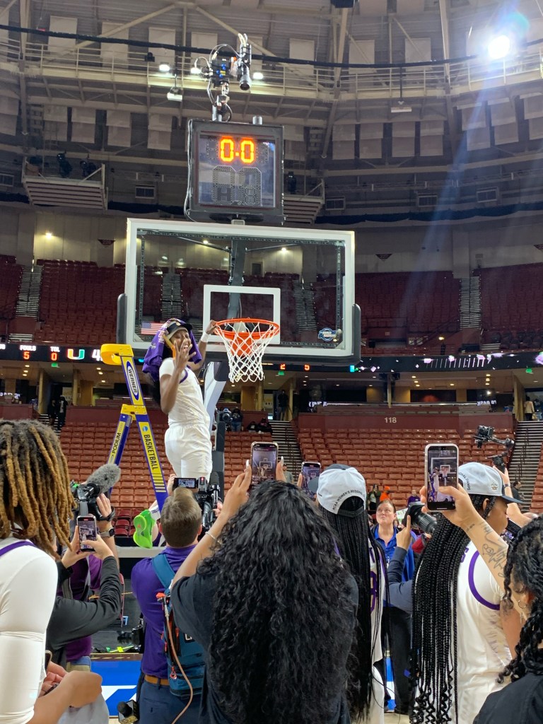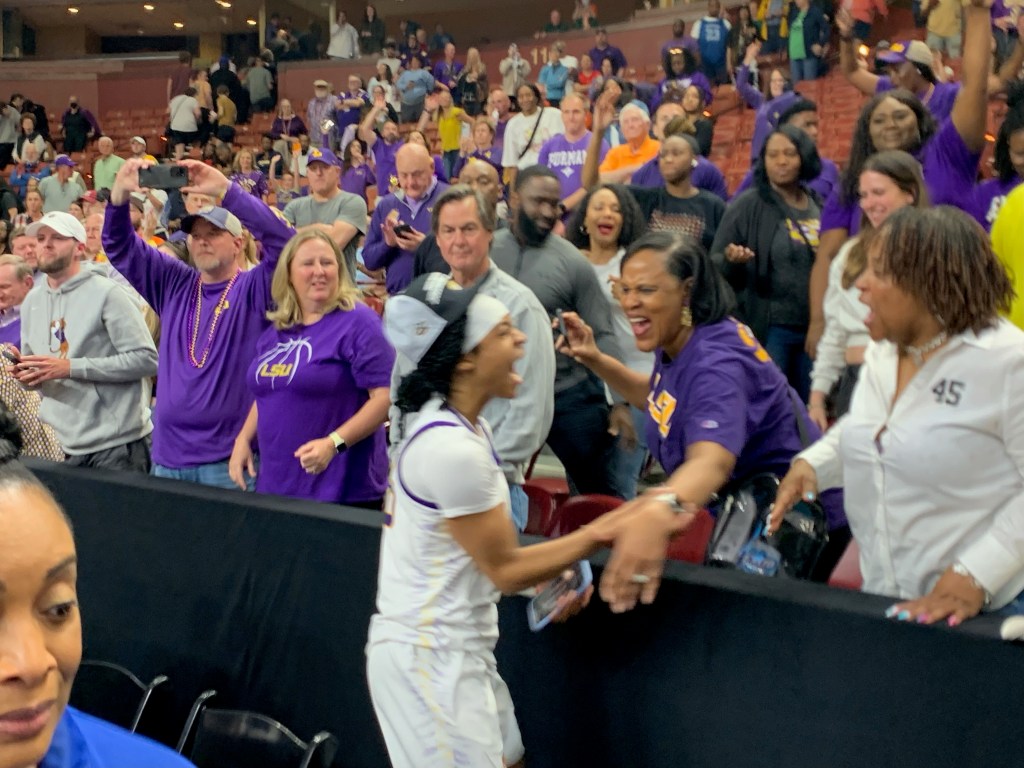 But the moment the brim hit Morris’ head, she ran across the court, around the media brigade, to the sidelines. Among the adoring fans was Morris’ mother, who she embraced and beamed back at. Throughout the past weeks, the Beaumont, Texas native has been adamant that she wants her senior night not to be the designated one in Baton Rouge but to be in Dallas, her home state.