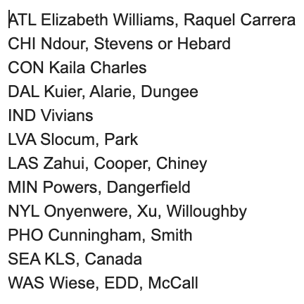 And notably, Seattle GM Em Adler was extremely aggressive on Slack, messaging me before the lists were even completed and working to acquire a vital player she saw as necessary to win a title: Aerial Powers. Given the specific areas Seattle has struggled since the break, it’s hard to argue with the intensity of her efforts.