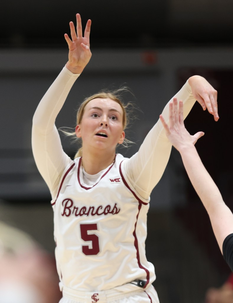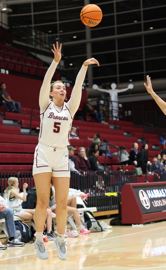 Olivia Pollerd knocks down one of two triples on the night against Pacific in a Broncos home victory. (Photo credit: Santa Clara Athletics/Don Jedlovec)