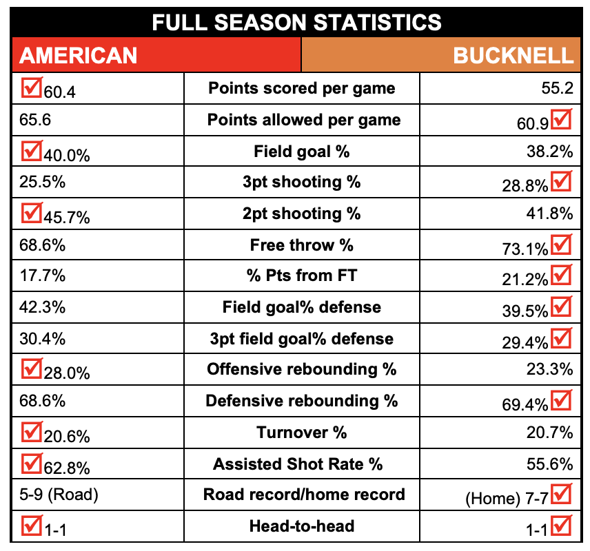 The key stat: Points in the paint. In Americanโs home win, the Eagles dominated inside, outscoring the Bison 42-12 in the paint and 58-47 on the scoreboard. In Lewisburg, Bucknell won that battle 22-14, and the game, 61-47. Whoโs converting around the rim and whoโs missing the easy ones?