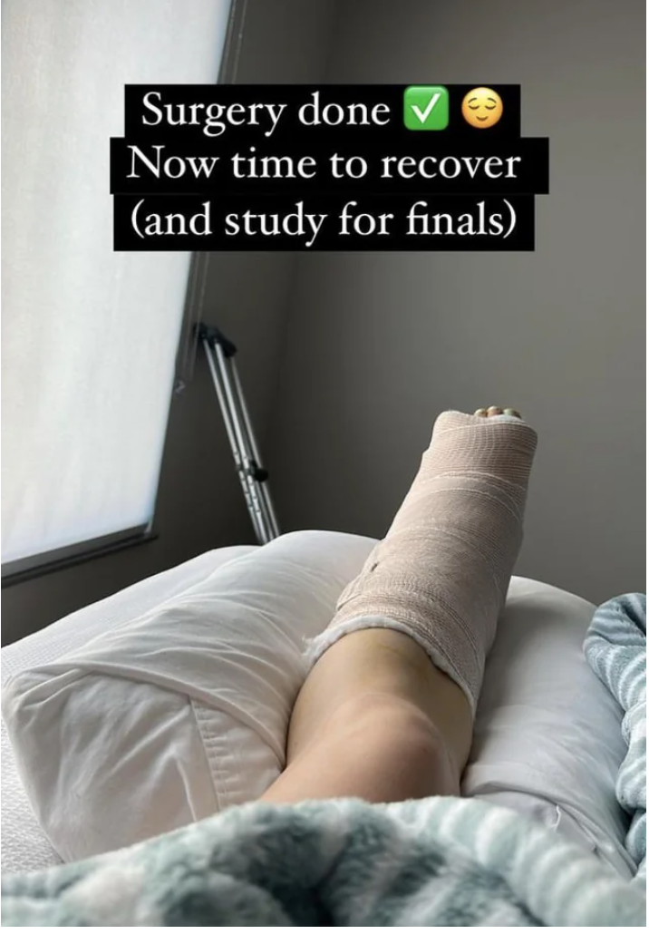 The TL;DR: A video of her beautiful bars followed by a shot of her left leg in a boot.