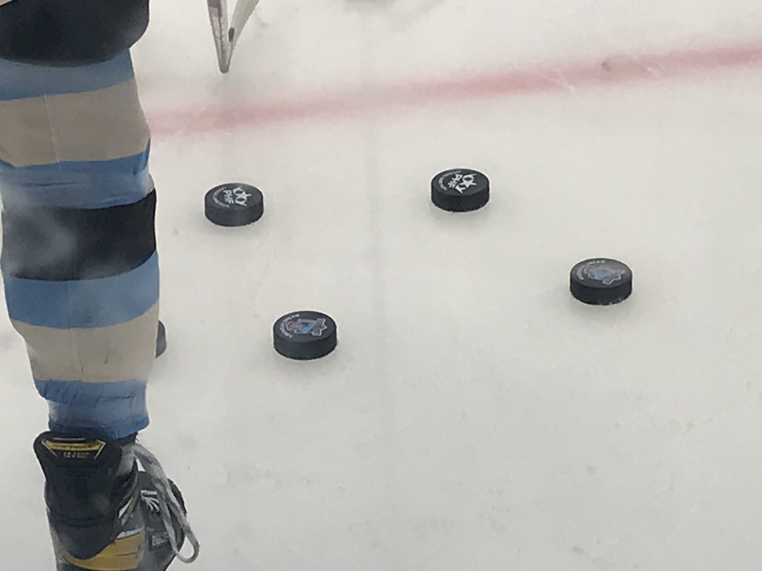 A player's hockey skate is pictured next two four hockey pucks on the ice. (Photo Credit: Dan Rice/The Ice Garden)
