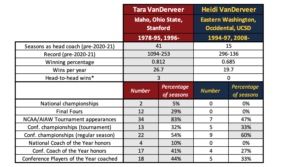 Despite Tara’s dominance in this comparison, Heidi’s coaching resume is stellar as well—and Tara told the San Diego Union-Tribune in 2014 that Heidi is the best coach in the family. Heidi’s teams have advanced to the NCAA Tournament in 47% of her seasons as head coach, and she has won conference championships at an even more impressive rate than her sister, taking home the regular-season title in 60% of her seasons and the tournament title in 33%. She has won over 68% of her games in her career and averaged nearly 20 wins per season, behind Tara’s absurd 81% winning percentage and 26.7 wins per season but ahead of so many others in the profession.