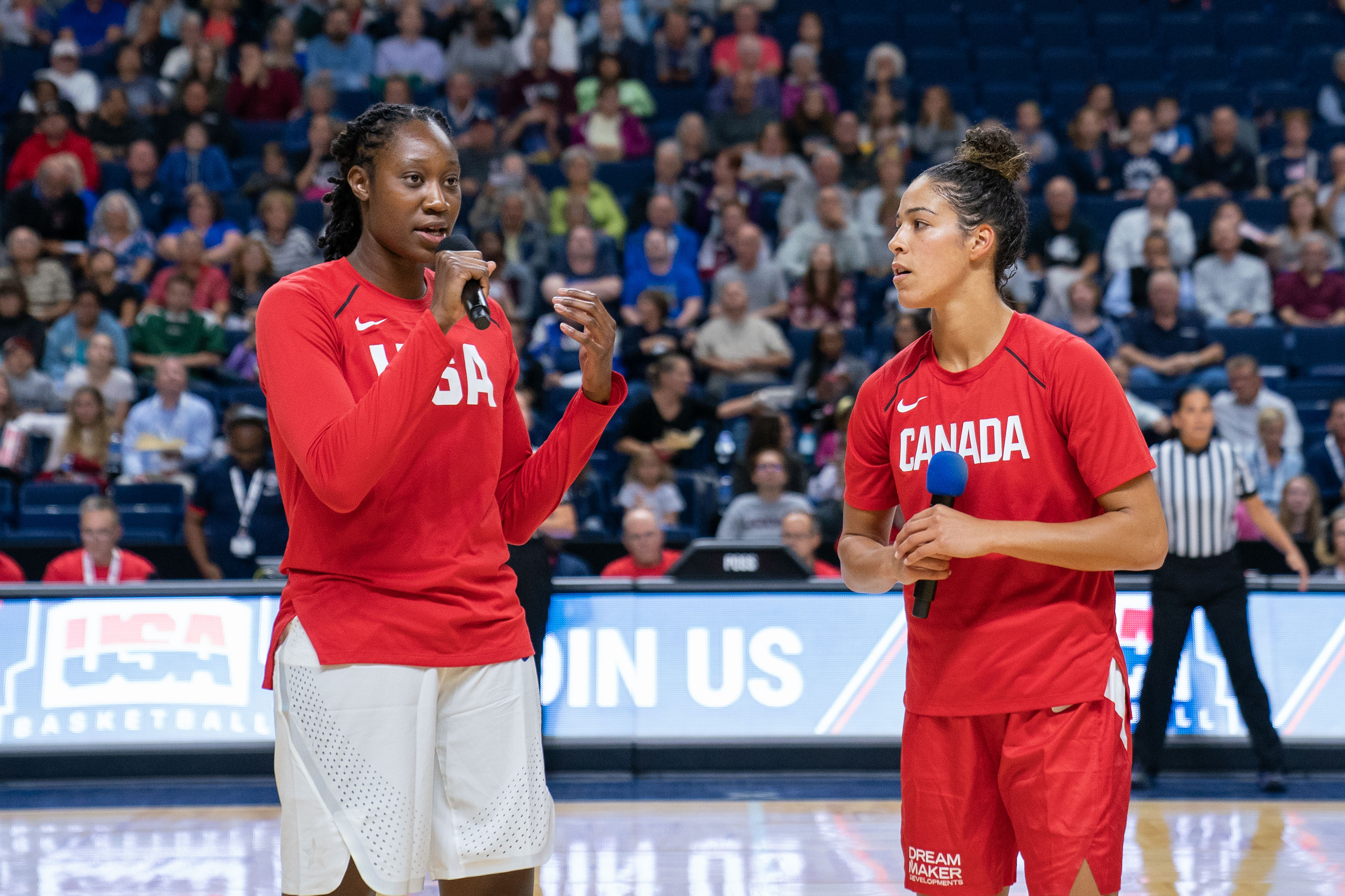 Team USA center Tina Charles (left) and Team Canada guard Kia Nurse welcome the fans before a FIBA World Cup exhibition game in Bridgeport, Connecticut, on September 8, 2018. Photo credit: Chris Poss