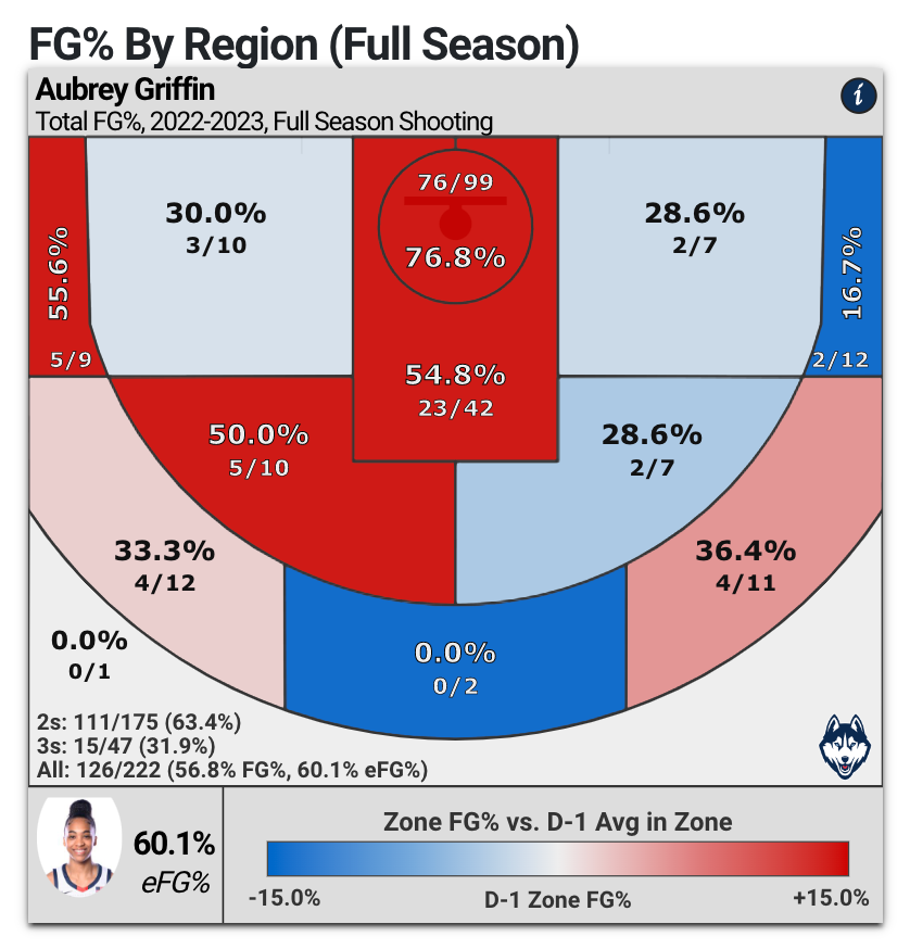 Griffinโs confidence as a shooter is massive for UConn and her development alike. She has made some worthwhile progression from beyond the arc, upping her 3-point percentage from 13.3% through her first two collegiate seasons to 31.9% as a redshirt junior.