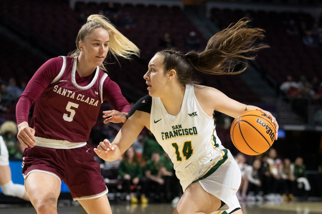 My thoughts on San Franciscoโ€™s performance: The Dons offense is electric. They have the ability to score quickly and get contributions from multiple players. If you havenโ€™t watched Krimili play before, find time to do so. The sophomore guard from Greece was the leading scorer in the WCC this year and shot the three very well. She didnโ€™t make any in this game, but she has added a jump shot this season and has vastly improved her finishing at the rim. Krimili had 18 points to go along with six rebounds and seven assists. Freshman forward Claudia Langarita has been a spark for the Dons this season. She had 16 points off the bench and can knock down the outside shot as well, making one three. The Dons struggled with rebounding and that is something they will need to shore up if they want to make a deep run in this conference tournament. San Francisco is a team that averages making eight threes per game but only made four. They made up for it by scoring 42 points in the paint. Coach Molly Goodenbour said the team has evolved this season and doesnโ€™t just have to rely on one way of winning.