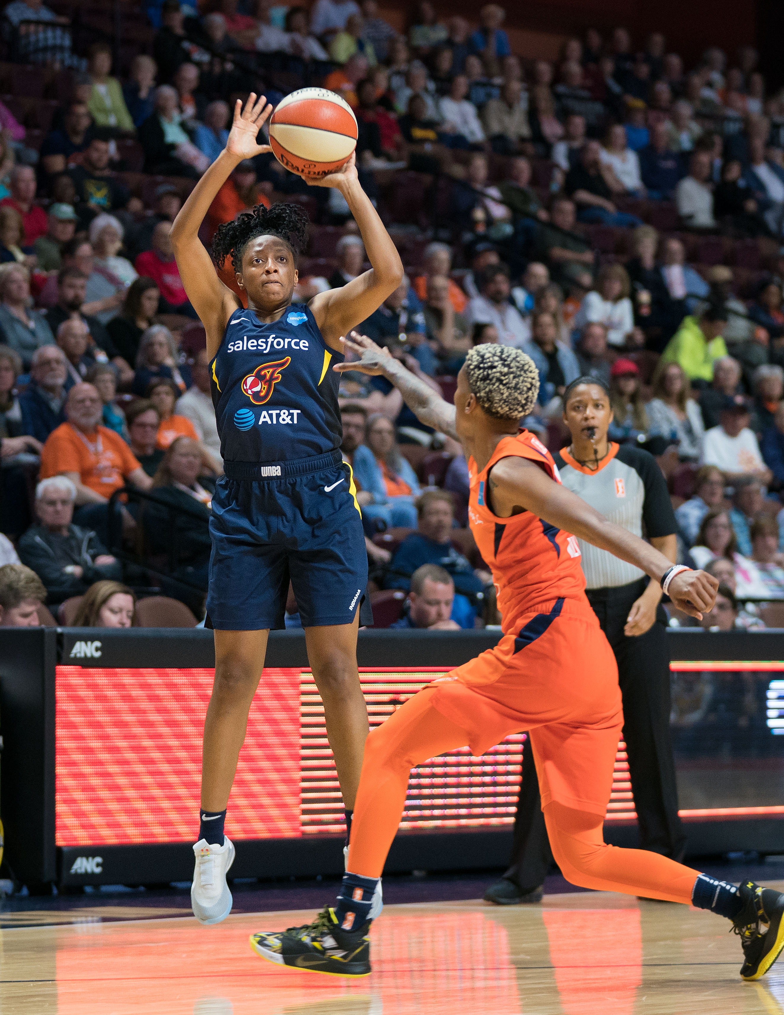 Indiana Fever guard Kelsey Mitchell (0) shoots during the WNBA game between the Indiana Fever and the Connecticut Sun at Mohegan Sun Arena, Uncasville, Connecticut, USA on May 28, 2019. Photo Credit: Chris Poss