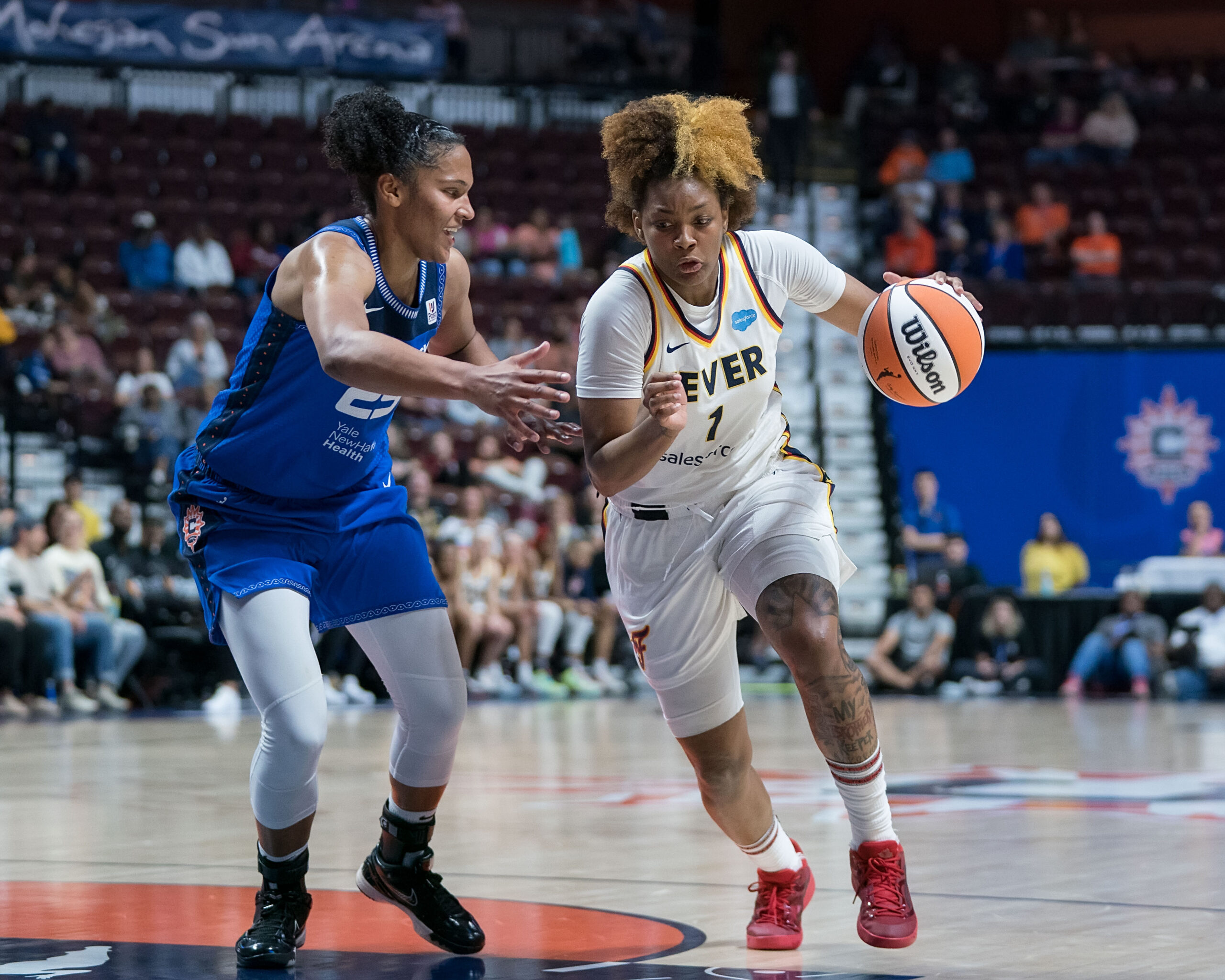 Indiana Fever forward NaLyssa Smith (1) drives to the basket as Connecticut Sun forward Alyssa Thomas (25) defends during the WNBA game between the Indiana Fever and the Connecticut Sun at Mohegan Sun Arena, Uncasville, Connecticut, USA on May 30, 2023. (Photo Credit: Chris Poss)