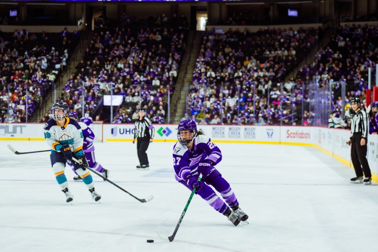Taylor Heise carries the puck in a game against the New York Sirens. Photo Credit: PWHL