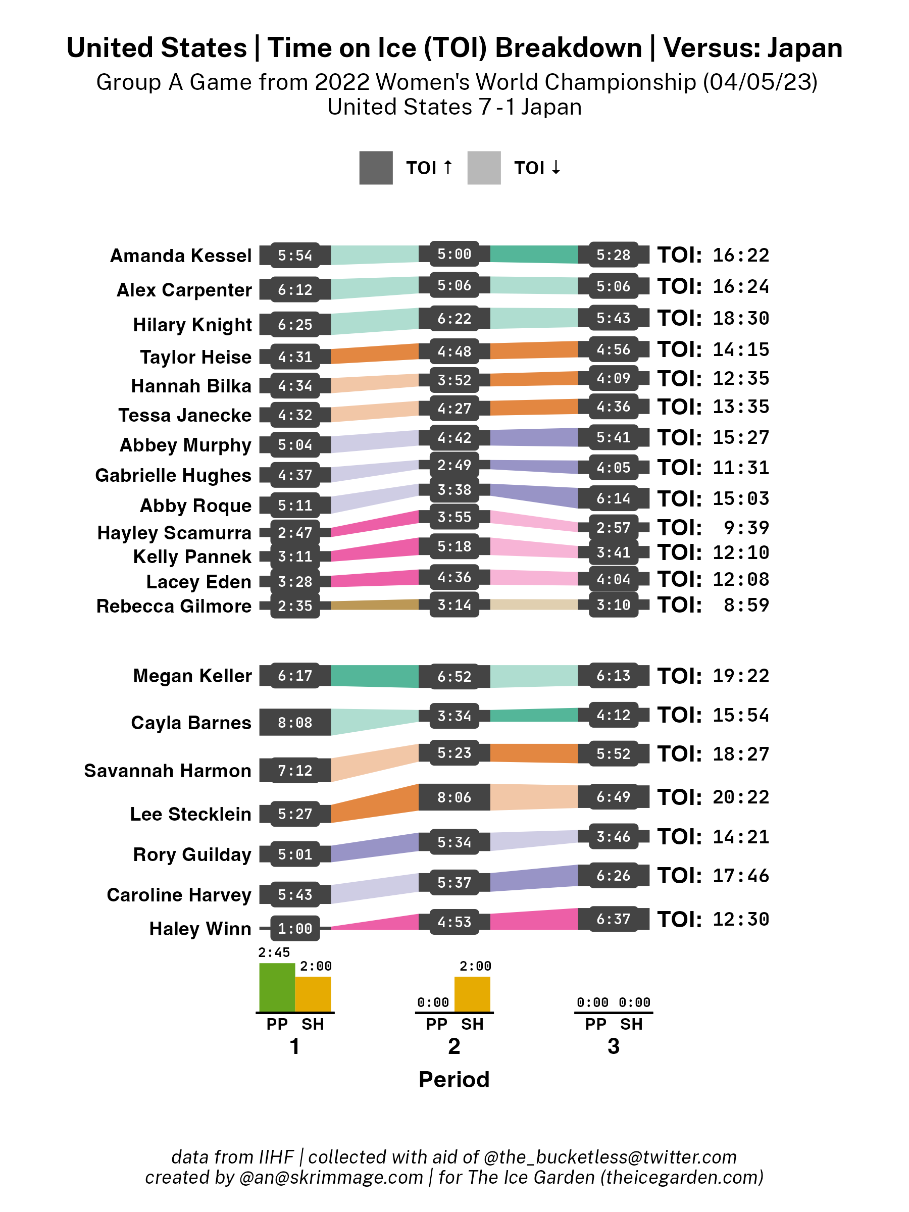 - the colored quadrilaterals connecting the grey rectangles = meant to better illustrate how the times on ice change between period for a given player, based on how much the colored shape narrows or widens when going from period to period when looking left to right