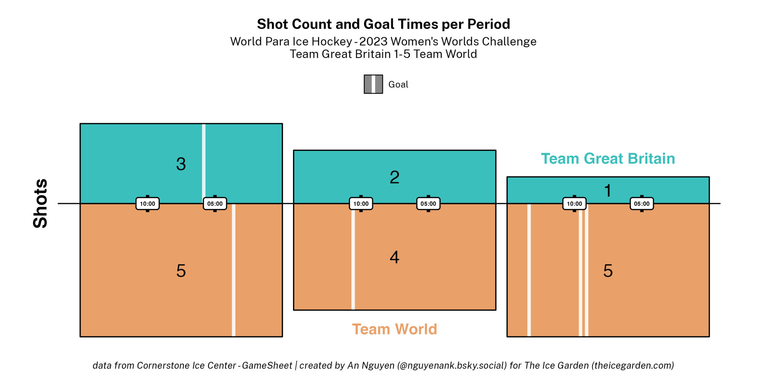 - Height of a colored rectangle section: proportional to the number of shots taken by that represented team in the period represented
