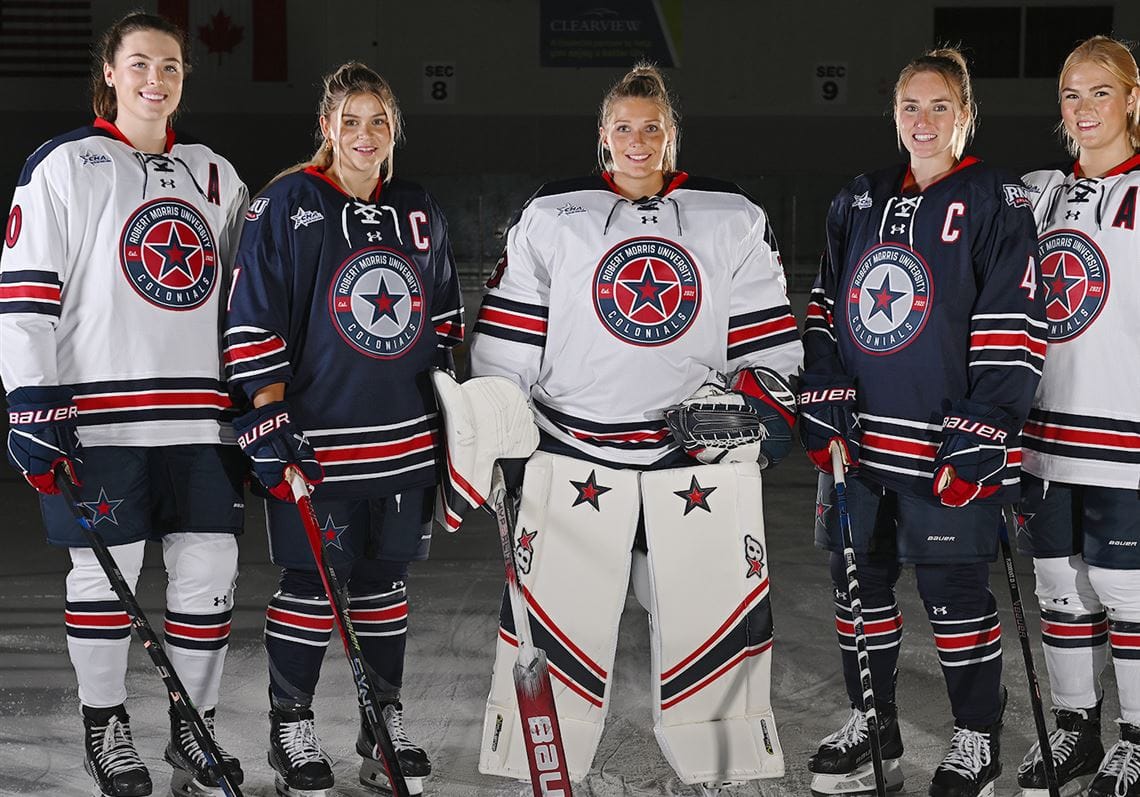 The Colonials may have been last in the conference standings this season, but they top my charts for the best jerseys in the AHA. Itโs hard to go wrong with some classic red, white, and blue, and the patriotic palette matches the teamโs name. I appreciate that the schoolโs colors rely on a darker navy blue, which helps the red accents pop. Roundel logos are hit or miss for me, and there might be a few too many words on RMUโs crest, but I like how striking the star is and appreciate that it shows up as a decal on the pants, too. The jersey design itself is simple but effective, with a classic triple stripe pattern. The rounded navy shoulder yoke on the white jerseys works, as does the RMU shoulder patch. The laces and the interesting number font pull it all together for a look that is striking without being overwhelming.ย