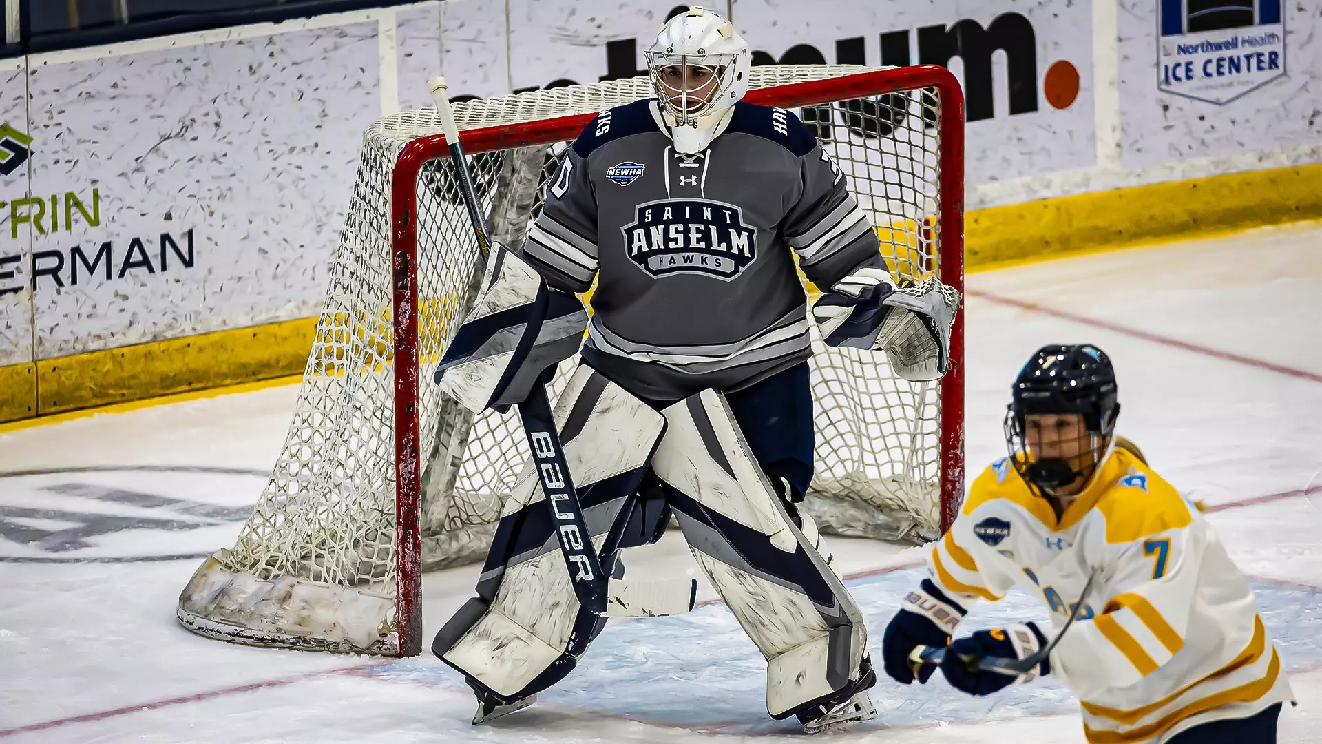 I feel a little bad putting Saint Anselm at the bottom of the jersey pile in the NEWHA because I donโt mind their white jerseys. Sure, they went with the diagonal wordmark, but the rest of the design is simplistically effective. Ultimately, the Hawks ended up here because of their grey jerseys. The combination of grey, white, and navy blue is so dully desaturated, especially when you have to put Saint Anselm against LIU. The worst offense, though, is the logo. The crest-like Saint Anselm athletics logo does not belong front and center on a jersey. Itโs too wordy, and itโs weirdly disproportionate because each line of text has a different spacing. I do not like it, plain and simple. The โHAWKSโ wordmark on the shoulder yoke is also weirdly placed and doesnโt really add anything to the design. If Saint Anselm had done a nicely arced wordmark with either their school name or mascot and got rid of the shoulder wordmark, maybe the grey jerseys would have been passable, but unfortunately, thatโs not the case.ย