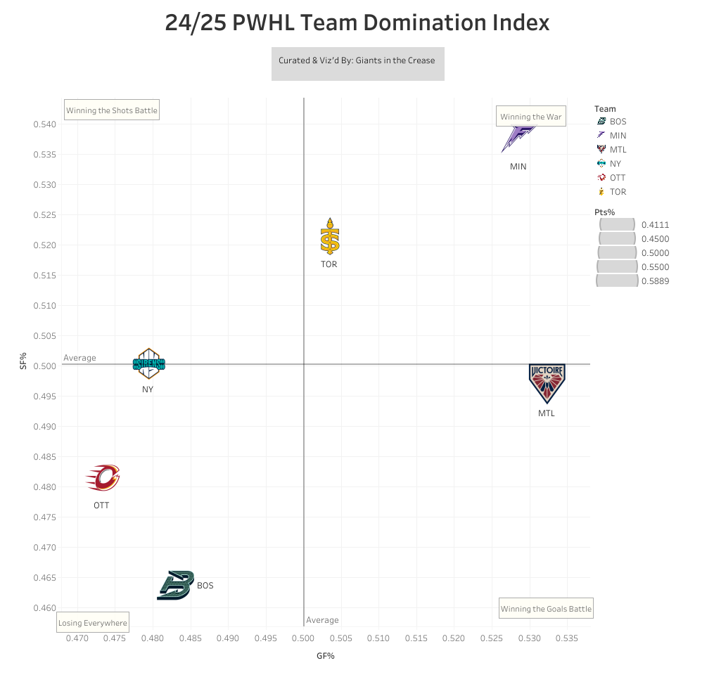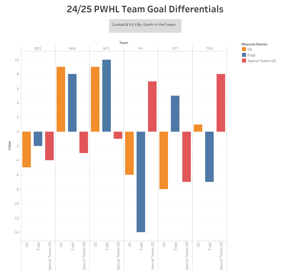 After last year’s playoffs the question that has been hanging around the Victoire’s head has been can they score? They scored ONE even-strength goal in the three playoff games versus Boston. Now part of that is that Aerin Frankel is among the best in the world but so is Ann-Renee Desbiens yet Boston still managed to score two even-strength goals a game against her proving to be the difference in that series. Even-strength scoring is proving to be the difference maker in the PWHL. You win the even-strength goal battle, you’re more than likely winning the game. Out of the eight teams to make the playoffs in PWHL history, the Toronto Sceptres this season are the only ones to make the playoffs with a negative even-strength goal differential which we’ll get to in their section.