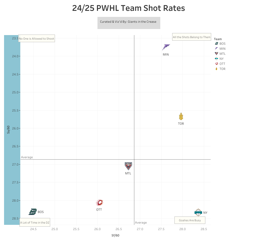 It’s not as though Toronto is lacking opportunities to score. They have the second best SF% (52.1%) in the league to go along with their second best SF/60 (27.97). They also have the third highest EVSF/GP at 22.27 to add onto their 51.4% EVSF%. If you’re just looking at their all situations goal numbers they have a positive goal differential and are third in the PWHL in GF/60 (2.36). It’s not last season’s eye popping numbers but those are all very solid numbers. They play a very well structured puck possession system.