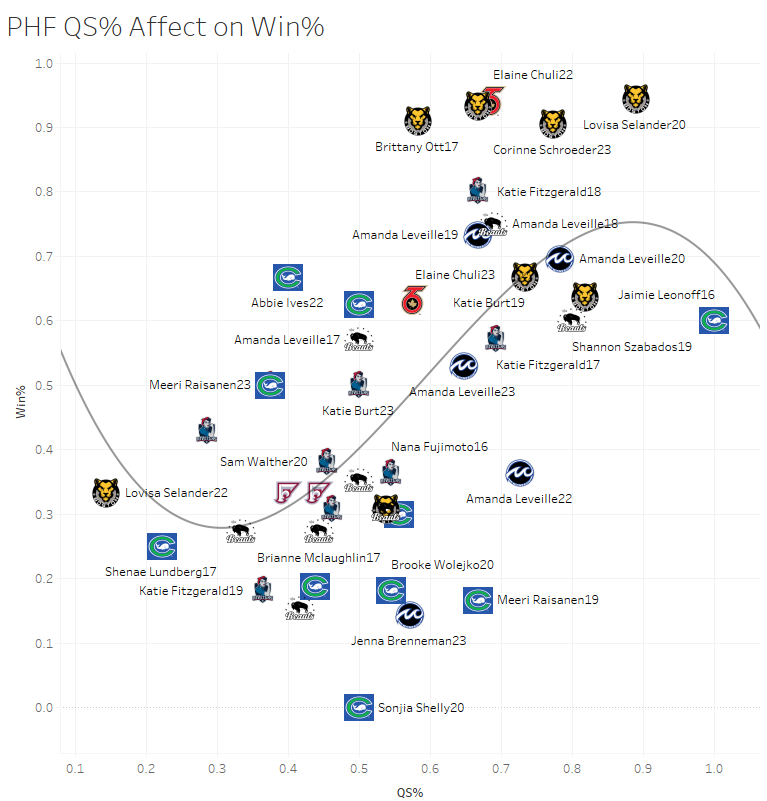 You’ll notice a similar trend with QS% and its relationship with win percentage. Eventually it reaches its peak and becomes redundant, because if your team isn’t scoring the necessary amount of goals to win games that you’re giving them quality starts in. It also just becomes nearly impossible to win 80% of games because that’s just how hockey is. No matter how good you are, unless you’re Lulea out of the SDHL, you’re not consistently scoring four goals a game to ensure wins. Eventually you are going to run into teams where you’ll still post a quality start, but you allow three goals and the opposing goalie allowed two.