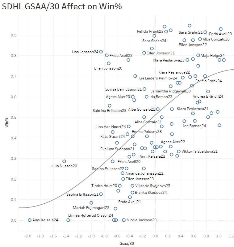 What we’re looking at here is the relationship between GSAA/30 and a goalie’s win percentage. We’re using GSAA/30 because I’ve found it’s the best way to do era adjusted save percentages without adding in extra calculations. Looking at the PHF and SDHL, which we have so much goalie stat data for, we see that win percentage rises with the GSAA/30. You’ll also notice, though, that eventually once you reach the highest peaks of GSAA/30, you start hitting diminishing returns in terms of win percentage. There are two reasons for that. If your GSAA/30 is that high, you’re either a goalie who is seeing so many shots against that your stats are starting to get a bit inflated, or you’re on a nearly unbeatable team where you’re not being challenged much so the scoring has a larger effect on win% than you do.