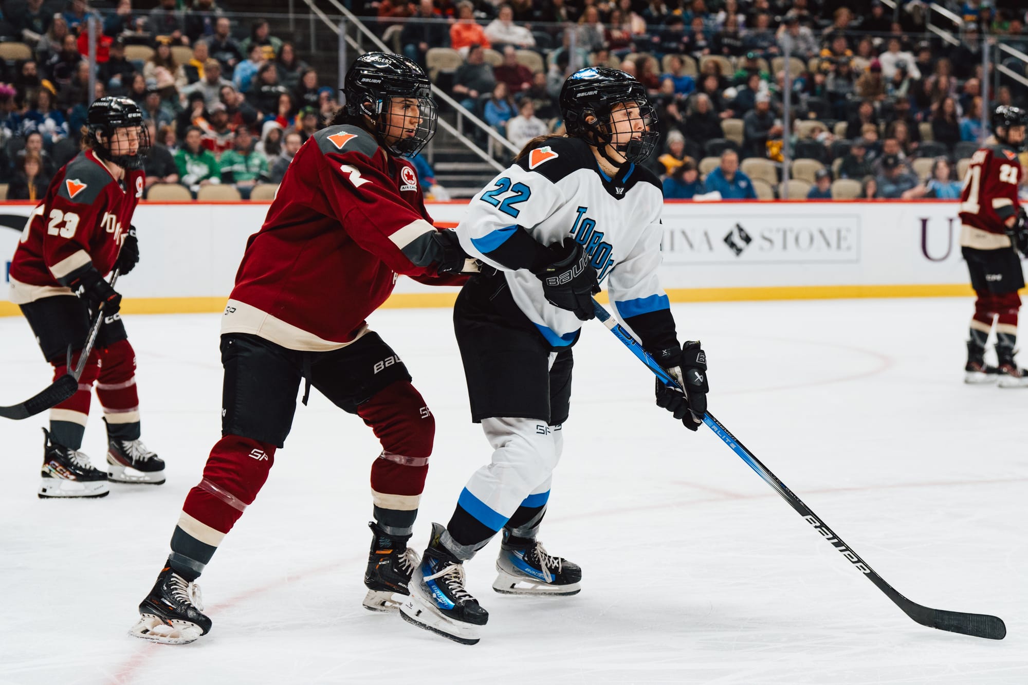Keopple defends Maggie Connors of PWHL Toronto. Photo via Arianne Bergeron/PWHL.