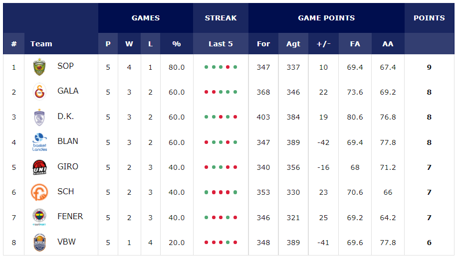 Sopron kicked off the season with three straight wins, only to lose in Week 4 against Fenerbahรงe and generate a lot of doubts about how real their 3-0 record had been. Fenerbahรงe has been one of the most disappointing sides in the EL so far, so losing to them and scoring a measly 47 points was rather worrying. Good for Sopron, though: The Hungarian side recovered from that blow and put up 79 points against Dynamo Kursk to silence the critics.