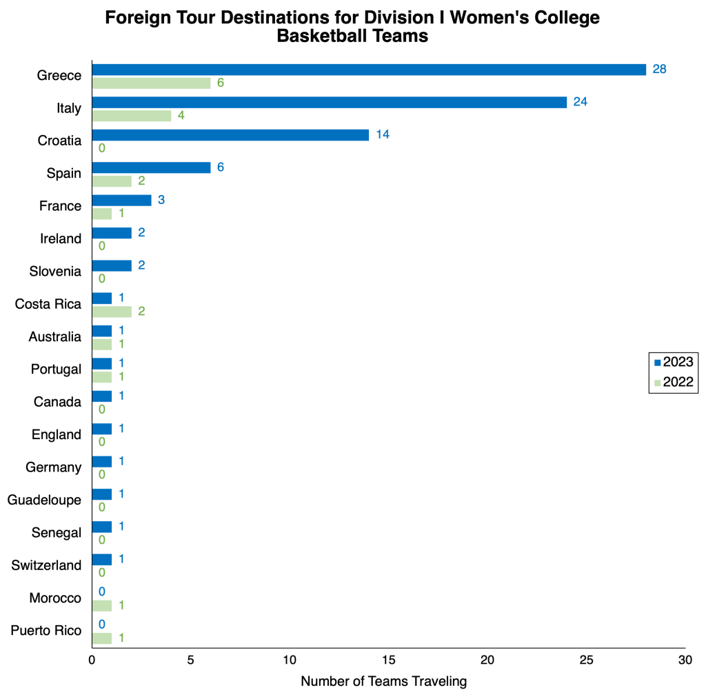 Whereas Greece and Italy were similarly popular with teams in 2022 as they are this summer, Croatia has become much more popular this summer. No teams went to Croatia in 2022, but its visitors this summer will include some of the sportโ€™s biggest names. Iowa, the national runner-up in 2022, will visit Italy and Croatia in early August and play three exhibition games. UConn will also head to Croatia later in the month, starting in senior guard Nika Mรผhlโ€™s hometown of Zagreb before visiting Samobor, Croatia; Slovenia; and Italy. (UConn and VCU are the only teams that will visit more than two countries this summer.)