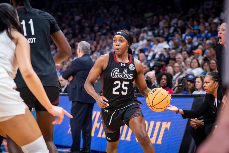 South Carolina guard Raven Johnson handles the ball against UConn in a Final Four game on April 3, 2026. (Photo credit: Domenic Allegra | The IX Sports)